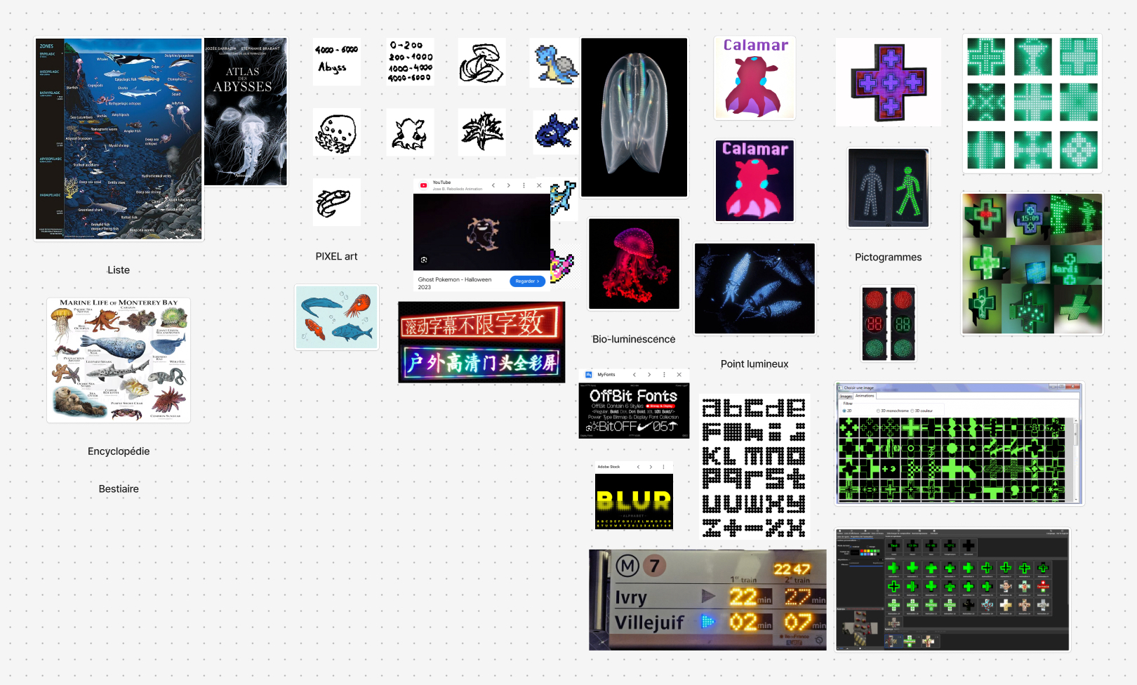 Panneau lumineux pouvant illustrant les espèces aquatiques vivant dans la zone abyssale ( entre 4000 mètres et 6000 mètres de profondeur )